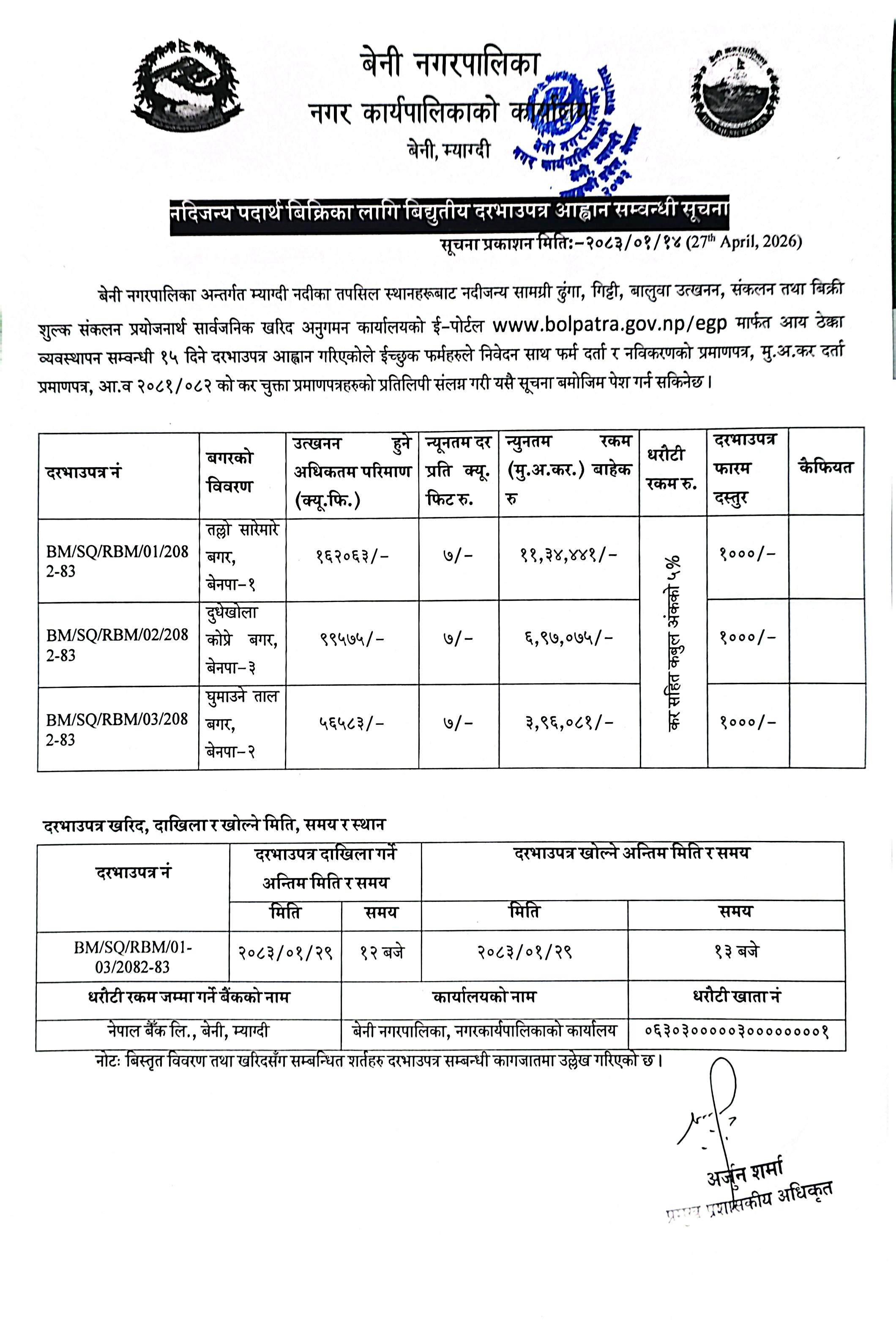 नदिजन्य पदार्थ बिक्रिका लागि बिद्युतीय दरभाउपत्र आह्वान सम्वन्धी सूचना ।