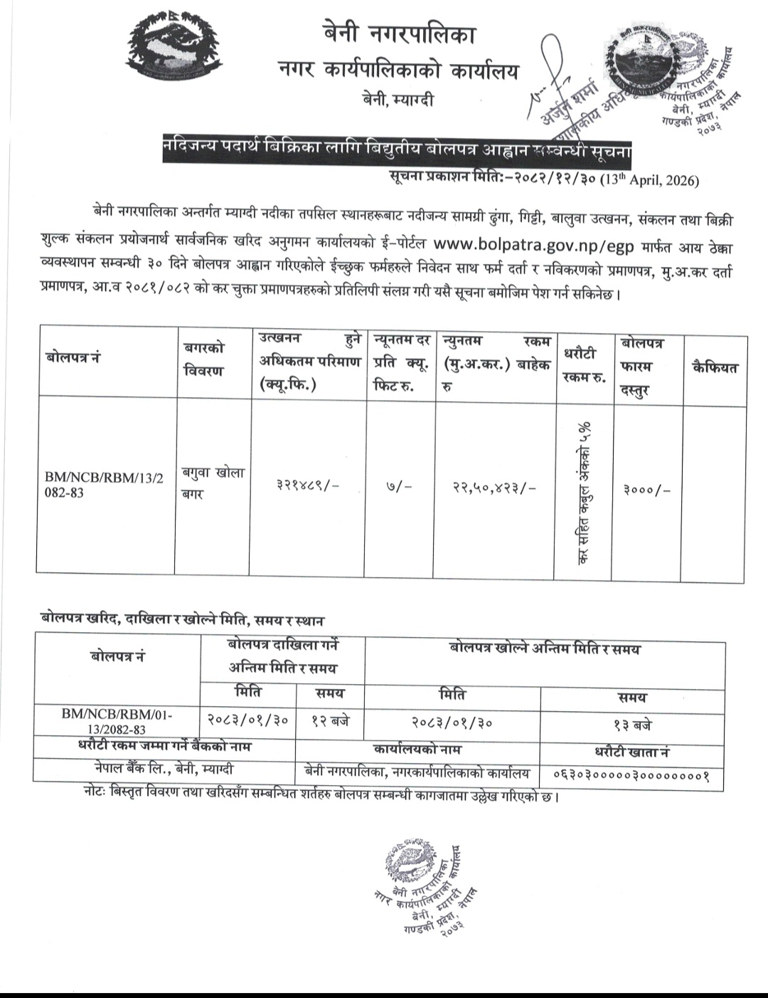नदिजन्य पदार्थ बिक्रिका लागि बिद्युतीय बोलपत्र आह्वान सम्वन्धी सूचना ।