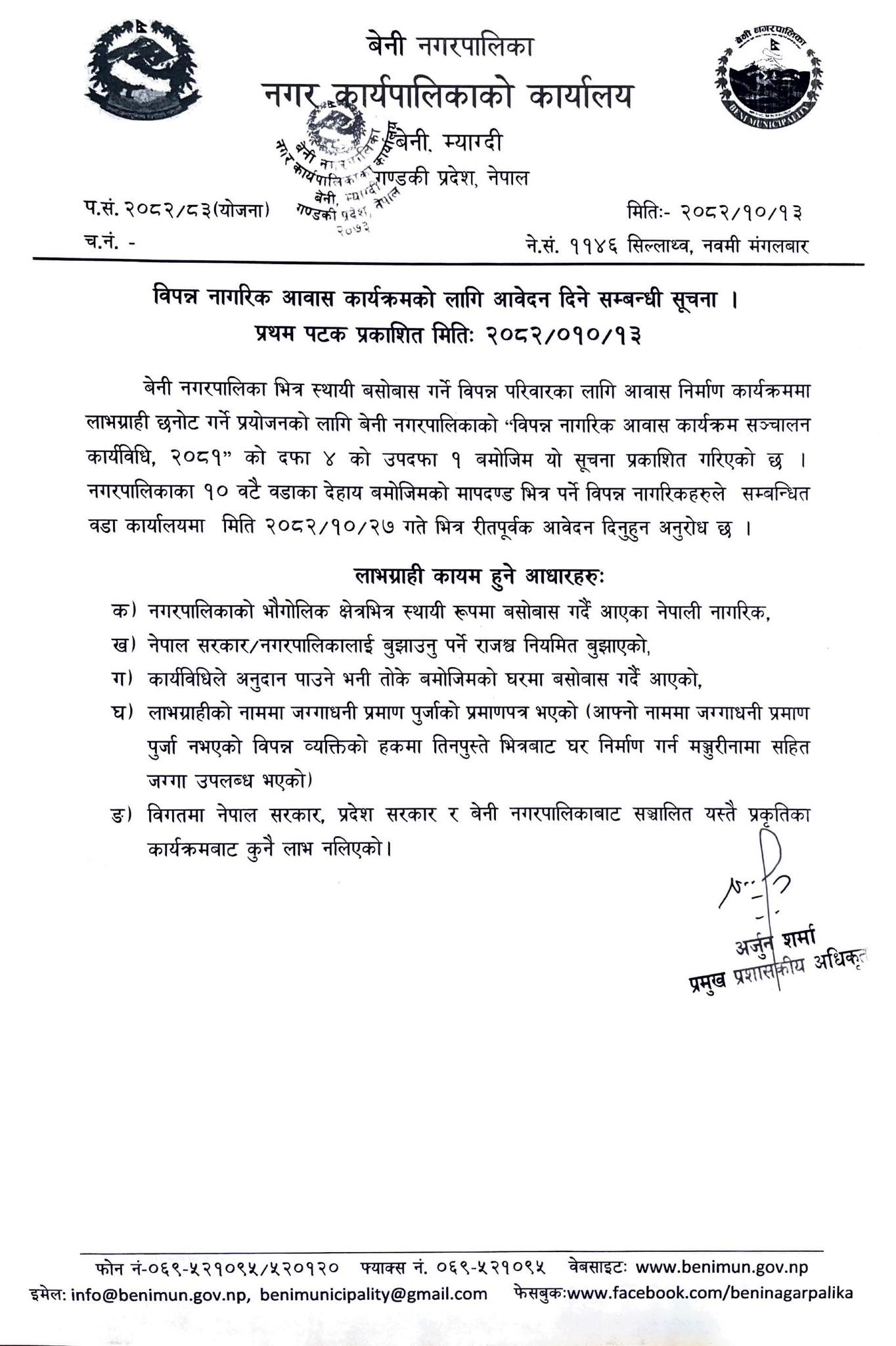 बेनी नगरपालिकाको आर्थिक सहायता वितरण कार्यविधि, २०८२