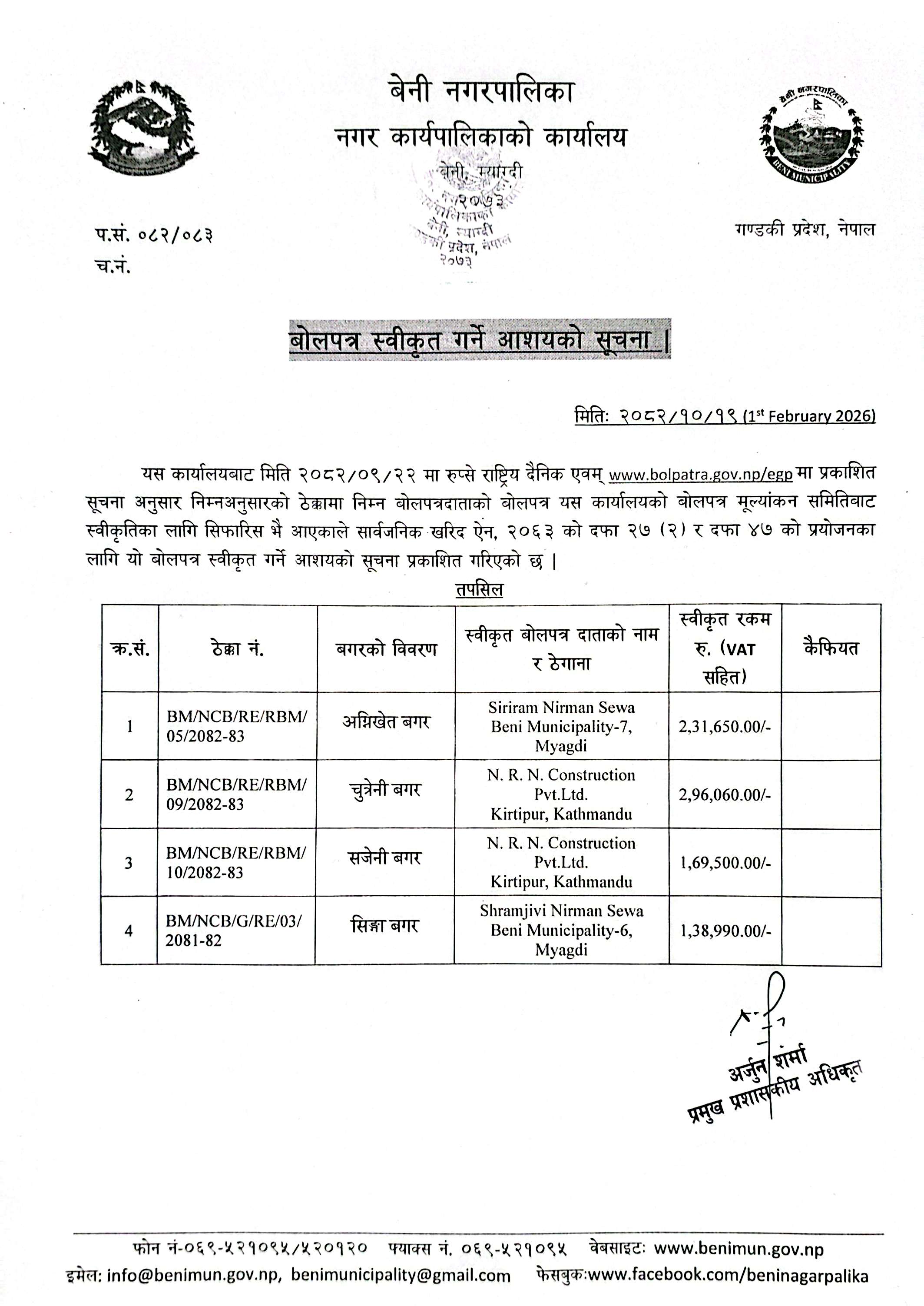 » बोलपत्र स्वीकृत गर्ने आशयको सूचना ।