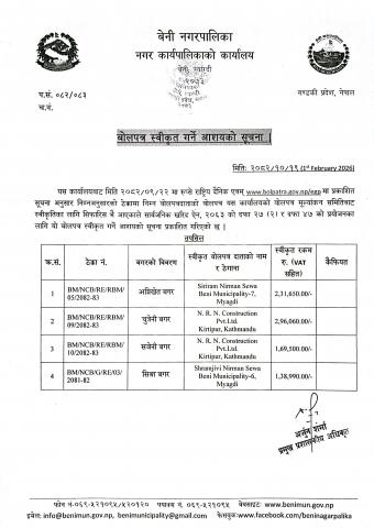 बोलपत्र स्वीकृत गर्ने आशयको सूचना ।